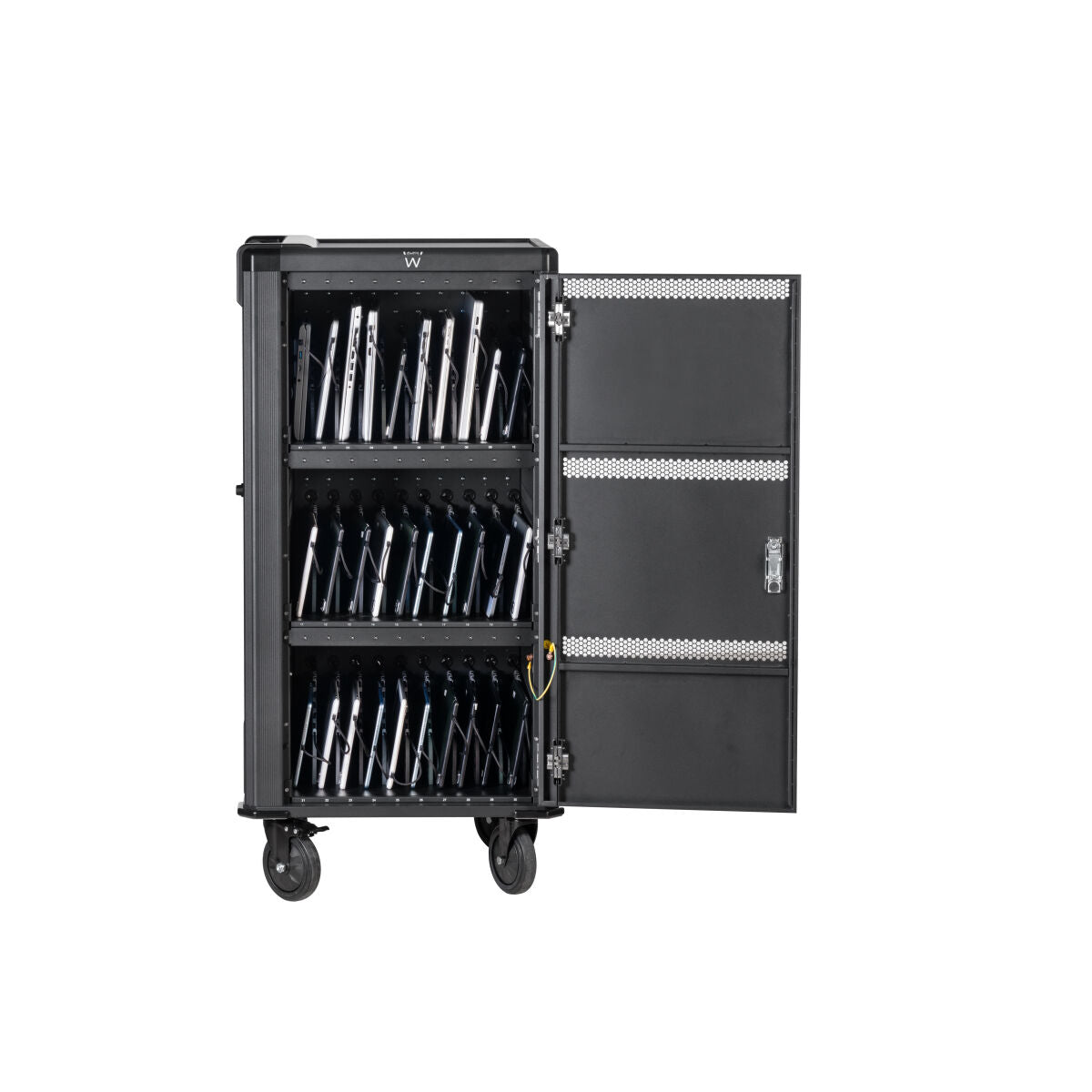 Le tableau d’affichage Ewent EW1702 est une armoire conçue pour la charge et le stockage sécurisé de jusqu’à 30 appareils USB-C, idéale pour les environnements éducatifs, bureaux ou espaces où plusieurs appareils électroniques sont gérés simultanément. Cette armoire intérieure se distingue par sa polyvalence et sa compatibilité universelle, s’adaptant à une grande variété d’appareils grâce à sa technologie de charge avec Power Delivery (PD) 65W, permettant une charge rapide et sécurisée. Elle fonctionne avec une alimentation en courant alternatif et dispose d’une tension d’entrée de 220-240 V, tandis que la tension de sortie maximale est de 20 V avec un courant de sortie d’adaptateur de 3,5 A, garantissant une alimentation stable et efficace pour chaque appareil connecté. Sa structure en couleurs noir et gris offre un design sobre et professionnel facilitant son intégration dans tout environnement de travail ou éducatif. Grâce à son design robuste et fonctionnel, l’armoire permet non seulement de garder les appareils organisés, mais aussi protégés pendant leur charge simultanée, optimisant l’espace et facilitant la gestion technologique dans les centres à forte demande de connectivité. Ce produit allie qualité et fonctionnalité pour offrir une solution compacte et sécurisée pour la charge massive d’appareils avec connexion USB-C. En résumé, l’armoire Ewent EW1702 représente un outil pratique et efficace pour la charge collective et le rangement ordonné d’appareils électroniques dans des environnements à utilisateurs multiples.